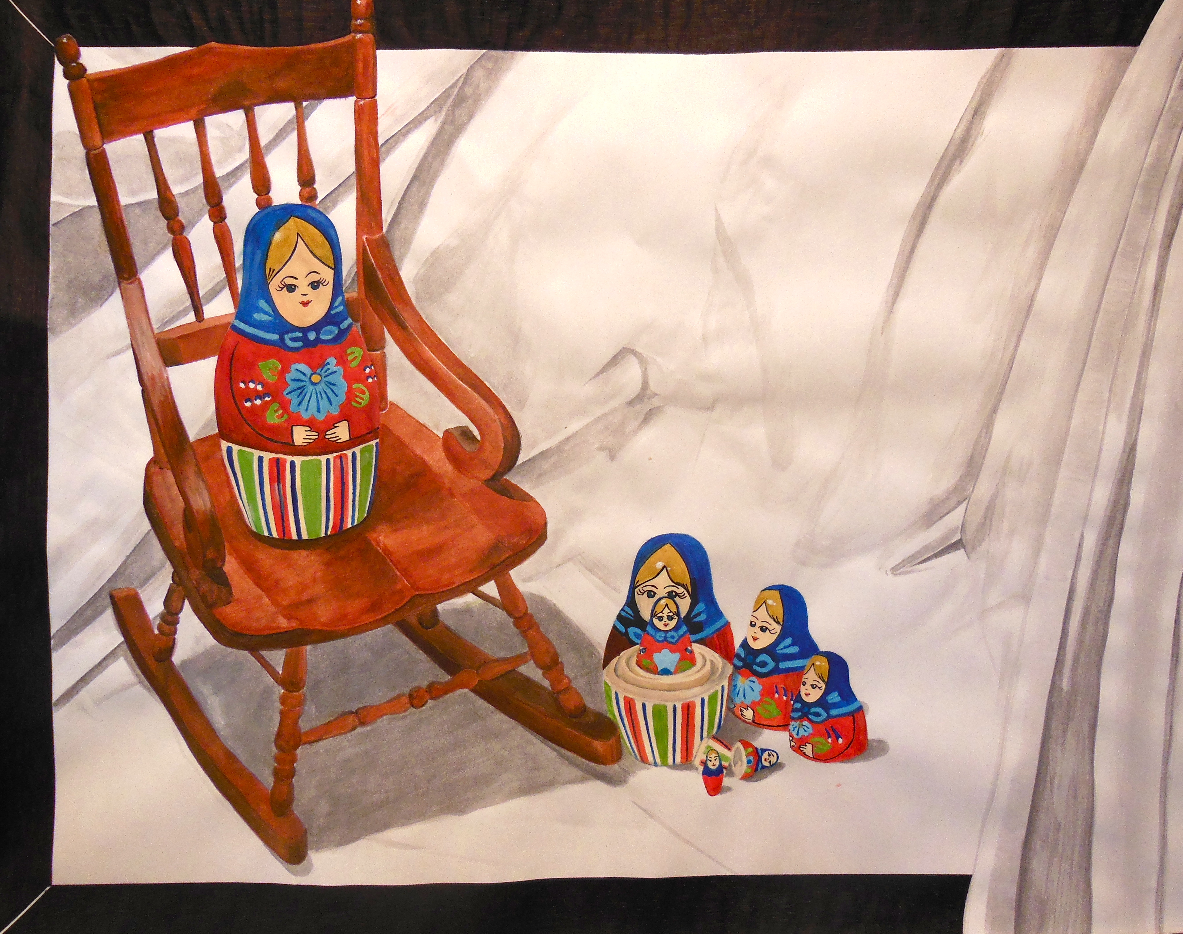 My professor put this composition together, a teddy on a tricycle next to a cow skull. I didn’t like the skull next to children toys but it can be a representation of life, we should enjoy life like children do (to the fullest!) because we don’t know when it might end…
